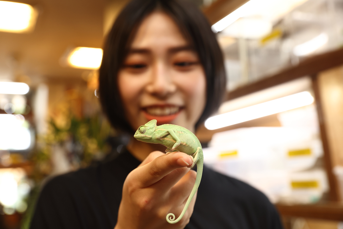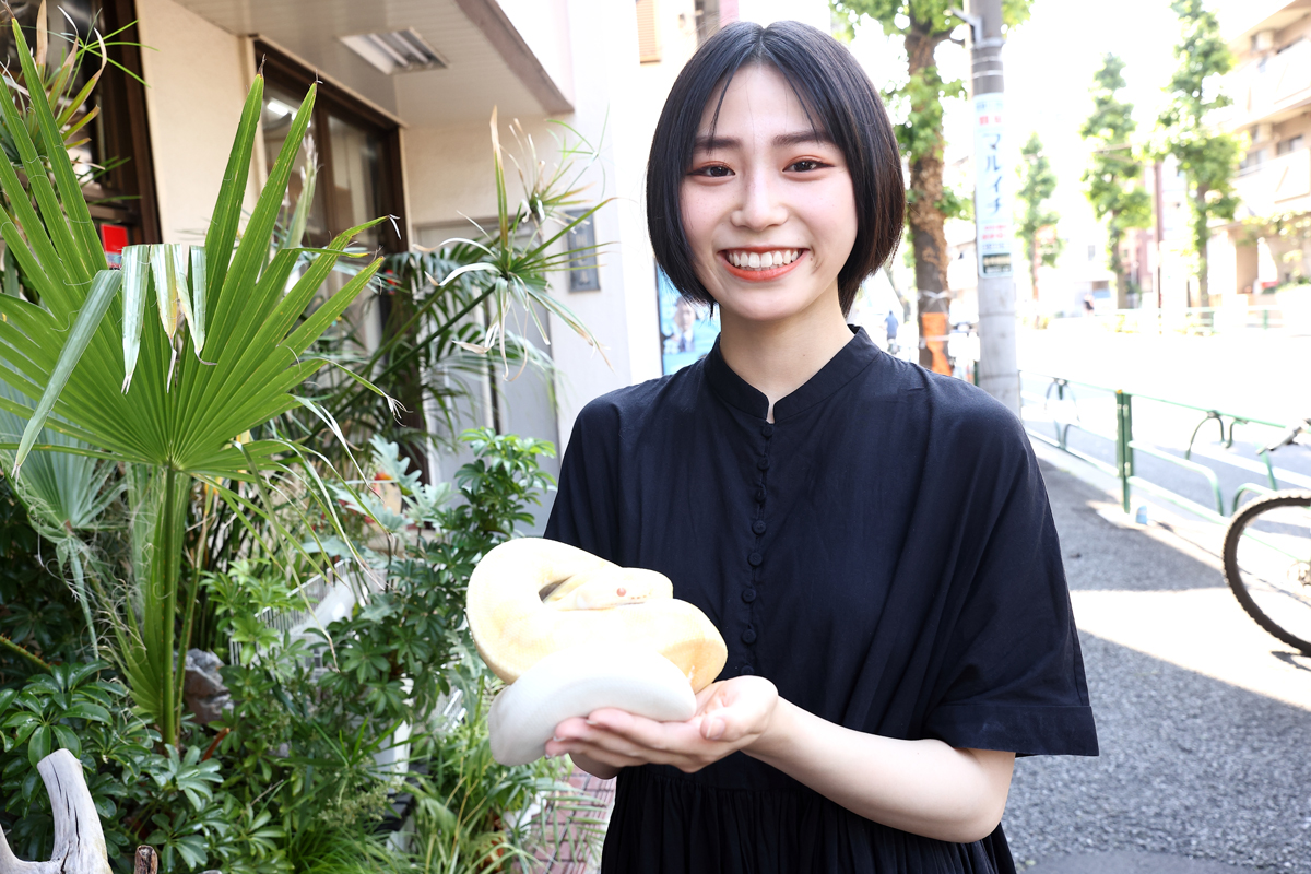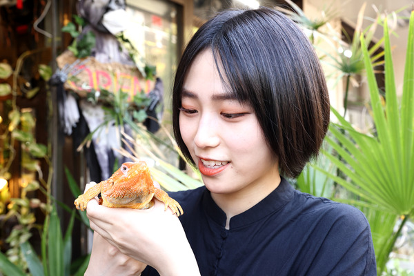 橋迫家は家族みんなが大の生き物好き。特に最近は爬虫類のペットが増えており、彼女の“爬虫類熱”もヒートアップ中とのこと。そこで、今回は爬虫類専門店で心ゆくまで爬虫類と触れ合ってもらった!http://getnavi.jp/wps/wp-content/uploads/2021/06/0B7A2852.jpg
