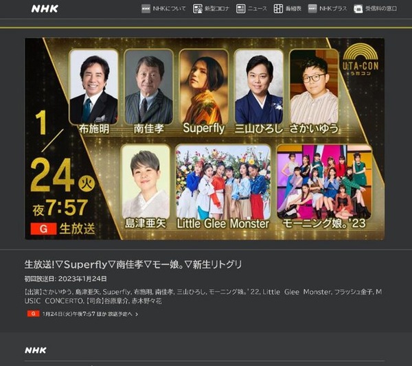 初回放送日: 2023年1月24日【出演】さかいゆう,島津亜矢,Superfly,布施明,南佳孝,三山ひろし,モーニング娘。’22,Little Glee Monster,フラッシュ金子,MUSIC CONCERTO,【司会】谷原章介,赤木野々花