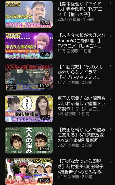 たまたまテレビ朝日YouTube番組の再生数上位の半分以上がなぜか鈴木愛理となった