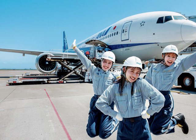 >貴重な空港での撮影とあって天候を危惧していた編集部だが、メンバーの晴れ女パワーで当日は雲一つない快晴に恵まれ、ANAのブルーのユニフォームもしっかり映える気持ちのいいカットの撮影に成功。